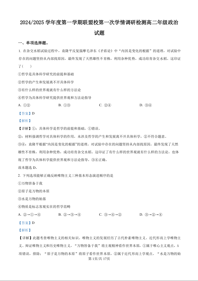 江苏省盐城市五校联考2024-2025学年度第一学期联盟校第一次学情调研检测政治(解析版)