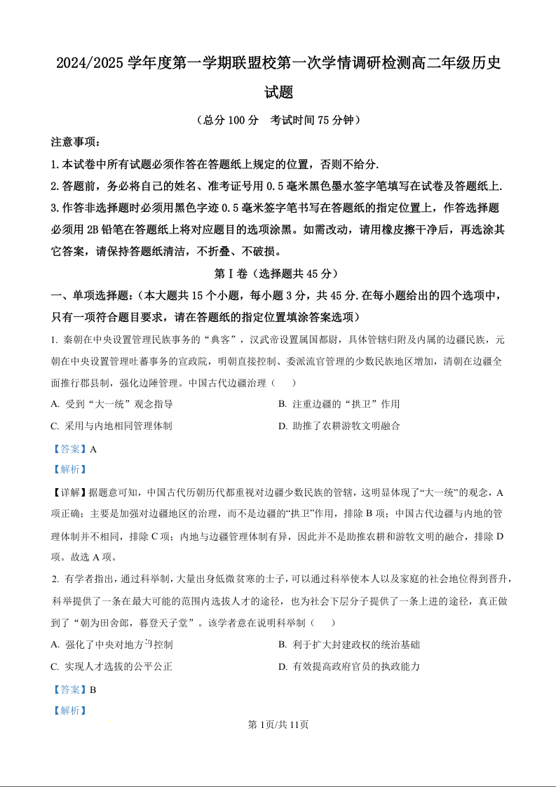 江苏省盐城市五校联考2024-2025学年度第一学期联盟校第一次学情调研检测历史(解析版)