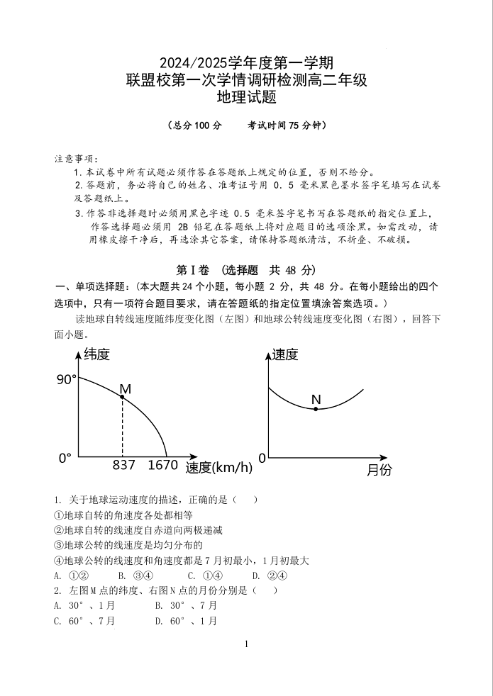 江苏省盐城市五校联考2024-2025学年度第一学期联盟校第一次学情调研检测地理