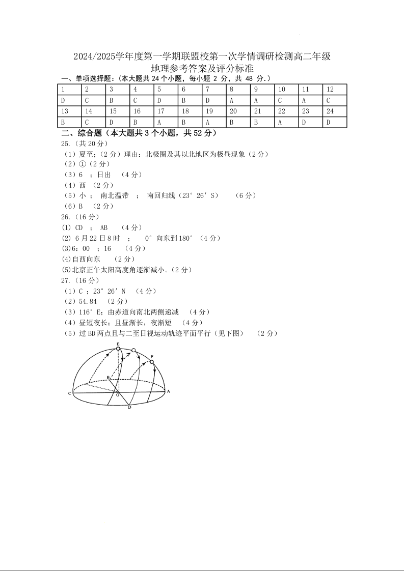 江苏省盐城市五校联考2024-2025学年度第一学期联盟校第一次学情调研检测地理答案