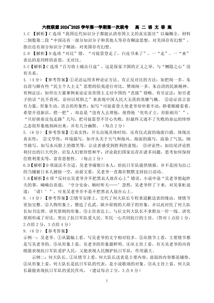 江苏省扬州市六校联盟2024~2025学年第一学期第一次联考语文答案