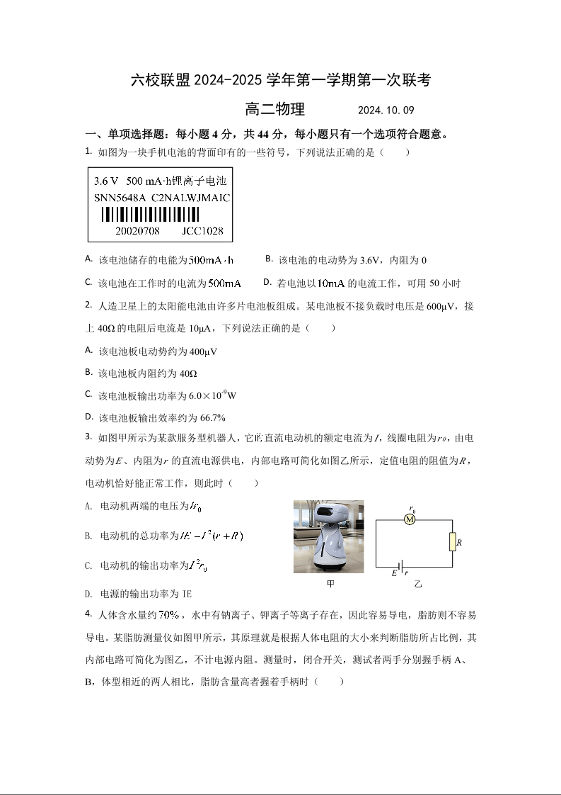 江苏省扬州市六校联盟2024~2025学年第一学期第一次联考物理