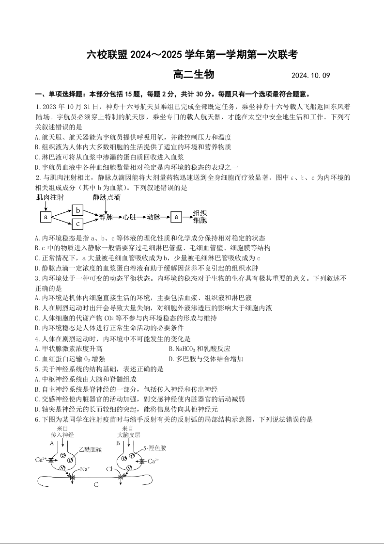 江苏省扬州市六校联盟2024~2025学年第一学期第一次联考生物