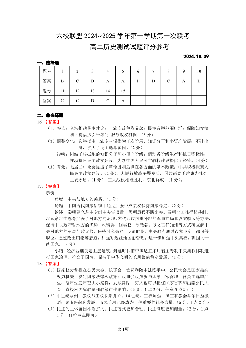 江苏省扬州市六校联盟2024~2025学年第一学期第一次联考历史答案