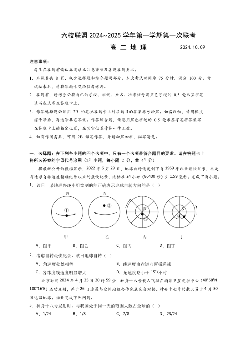 江苏省扬州市六校联盟2024~2025学年第一学期第一次联考地理