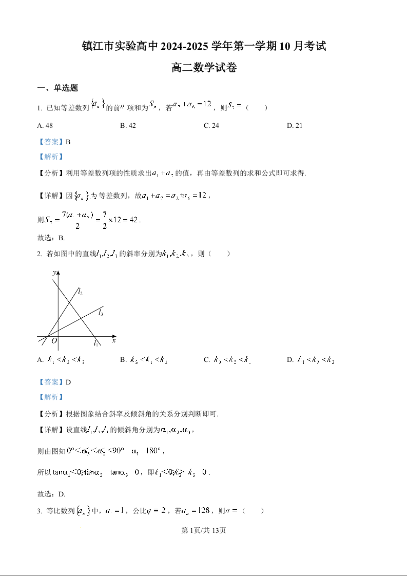 江苏省镇江市实验高级中学、镇江市第二中学等校2024—2025学年度第一学期高二年级阶段性测试数学(解析版)