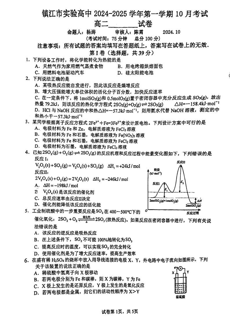江苏省镇江市实验高级中学、镇江市第二中学等校2024—2025学年度第一学期高二年级阶段性测试化学