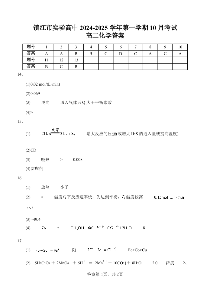 江苏省镇江市实验高级中学、镇江市第二中学等校2024—2025学年度第一学期高二年级阶段性测试化学答案