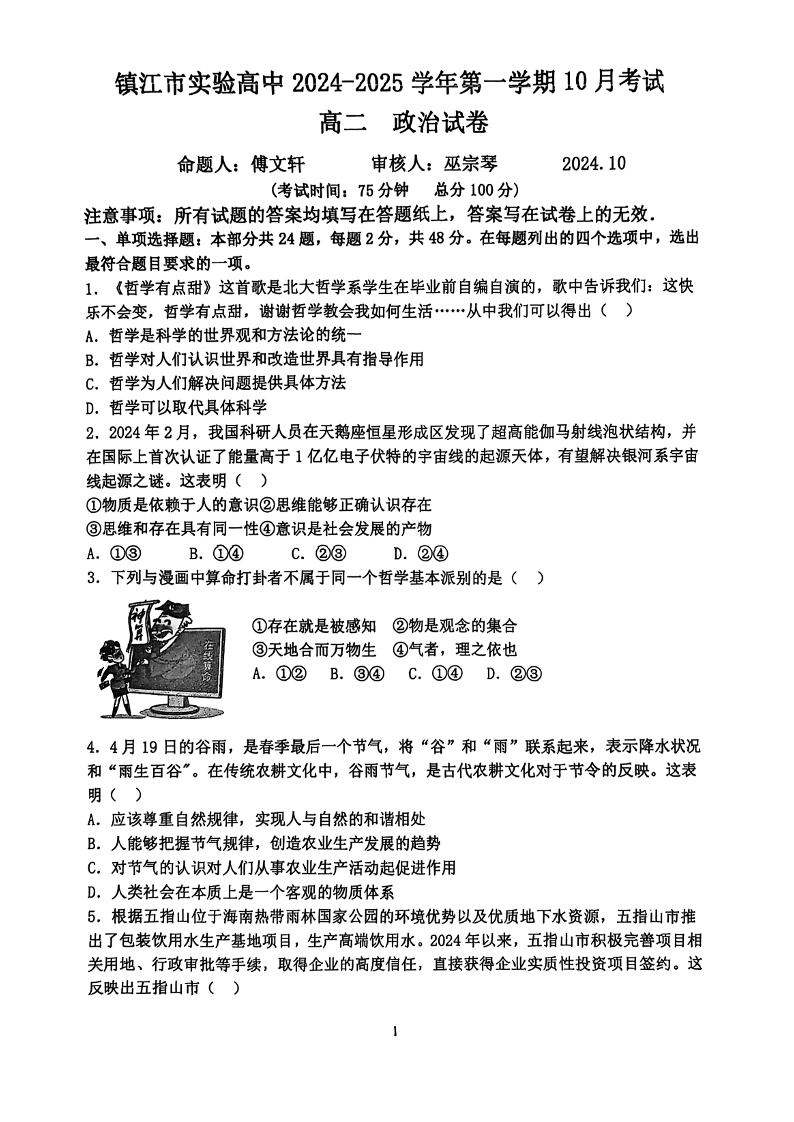 江苏省镇江市实验高级中学、镇江市第二中学等校2024—2025学年度第一学期高二年级阶段性测试政治