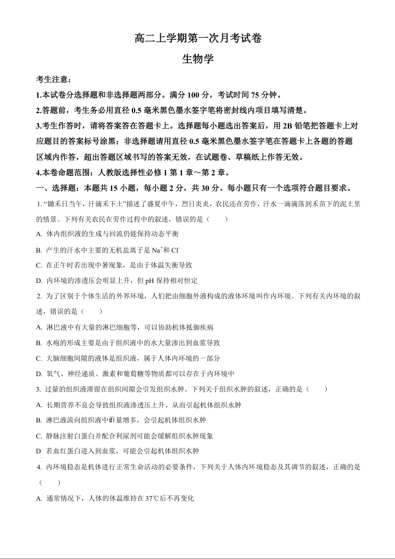 辽宁省名校联盟2024-2025学年高二上学期第一次月考生物