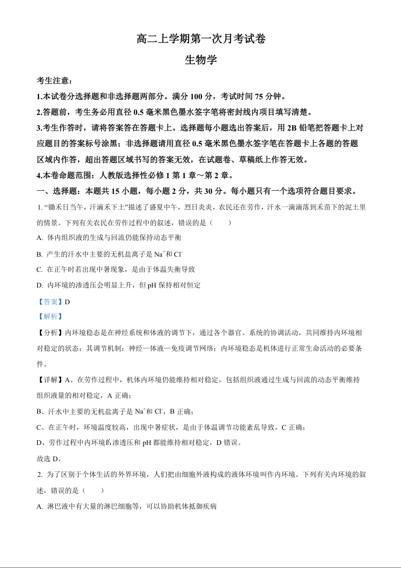 辽宁省名校联盟2024-2025学年高二上学期第一次月考生物答案