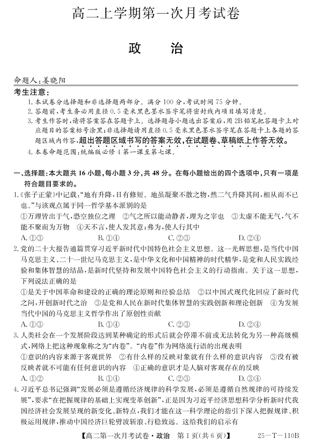 辽宁省名校联盟2024-2025学年高二上学期第一次月考政治