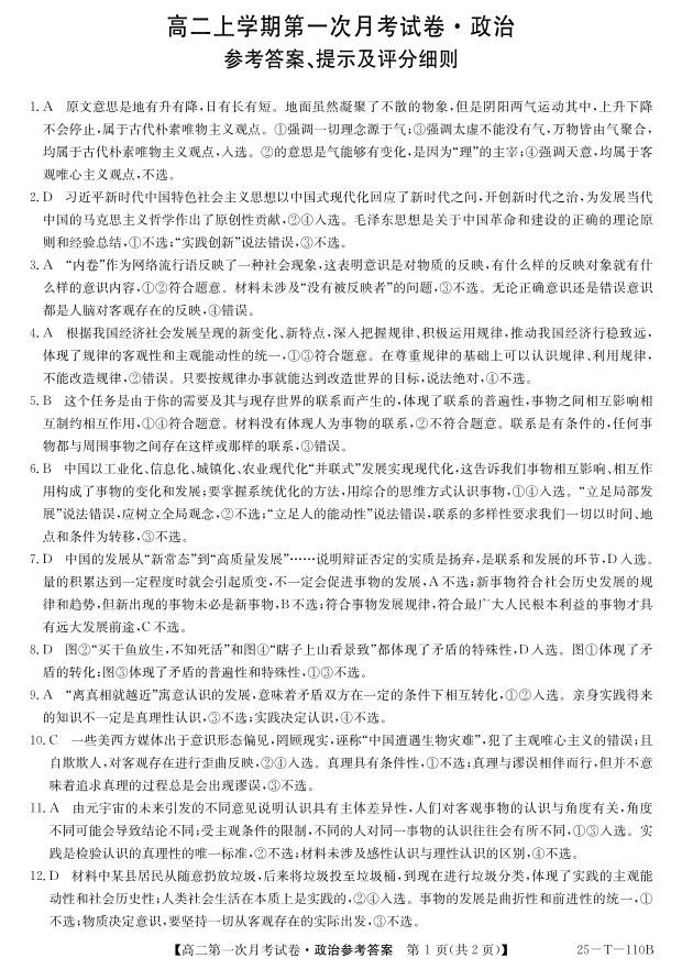 辽宁省名校联盟2024-2025学年高二上学期第一次月考政治答案