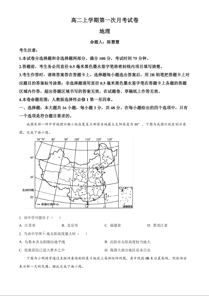 辽宁省名校联盟2024-2025学年高二上学期第一次月考地理