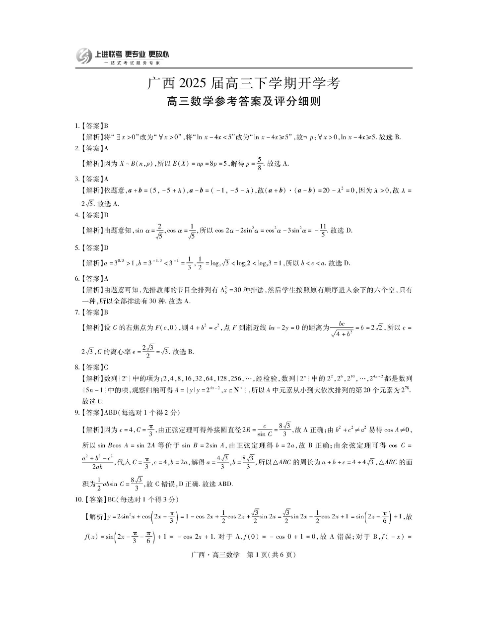 广西上进联考2025届下学期2月高三开学考试数学答案