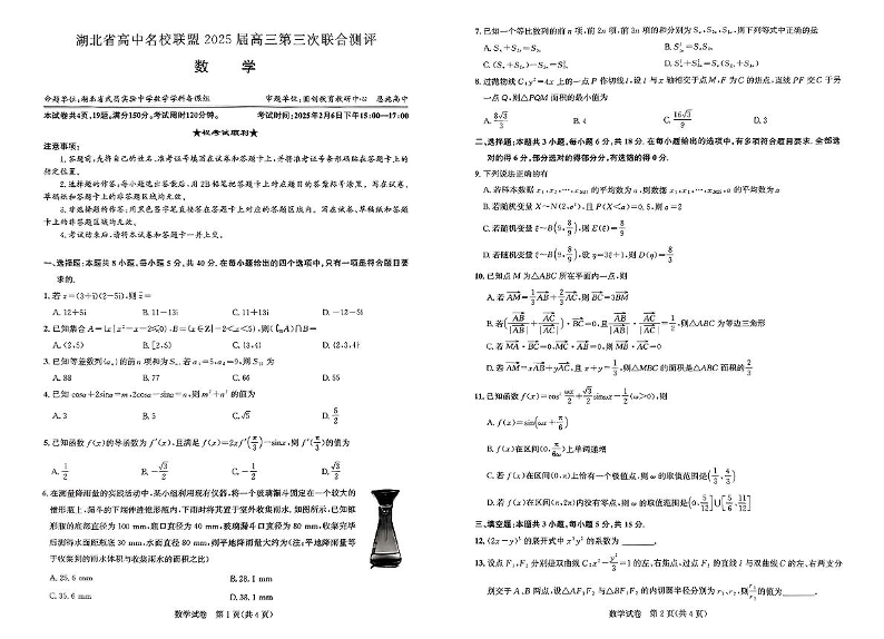 湖北省圆创高中名校联盟2025届高三第三次联合测评数学