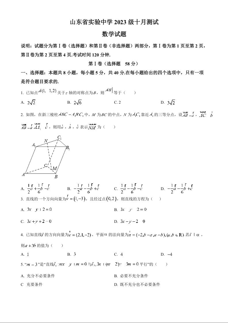 山东省实验中学2023 级高二年级十月测试数学+答案