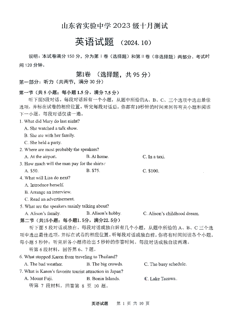 山东省实验中学2023 级高二年级十月测试英语+答案