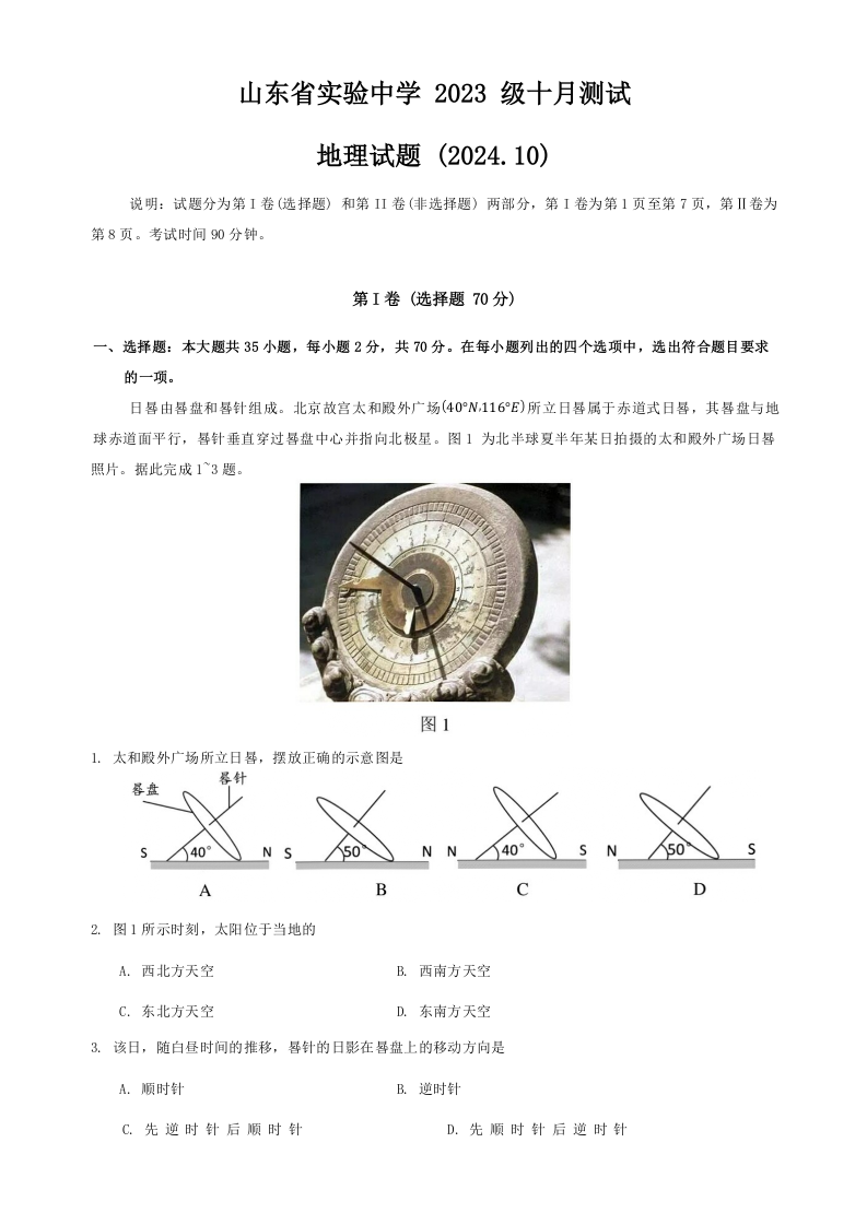 山东省实验中学2023 级高二年级十月测试地理+答案