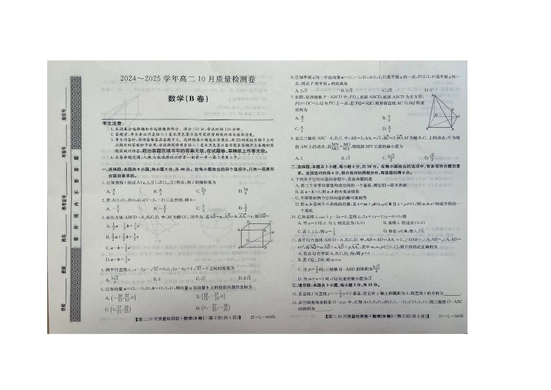 山西省大同市2024~2025学年高二10月质量检测数学