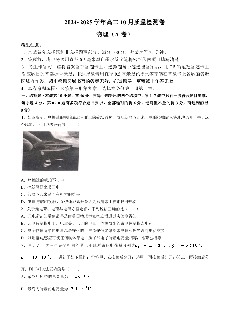 山西省大同市2024~2025学年高二10月质量检测物理+答案