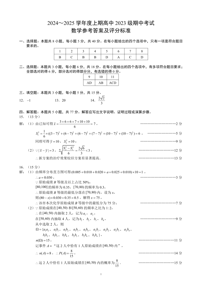四川省成都市蓉城部分学校2024-2025学年度高中2023级期中考试数学答案