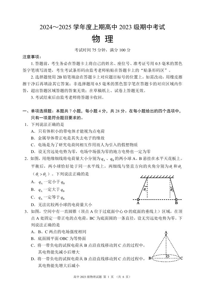 四川省成都市蓉城部分学校2024-2025学年度高中2023级期中考试物理