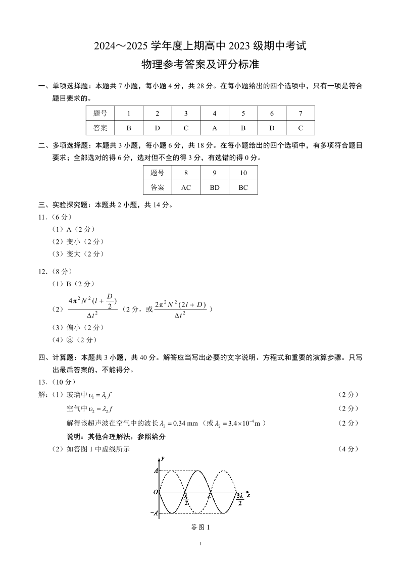 四川省成都市蓉城部分学校2024-2025学年度高中2023级期中考试物理答案