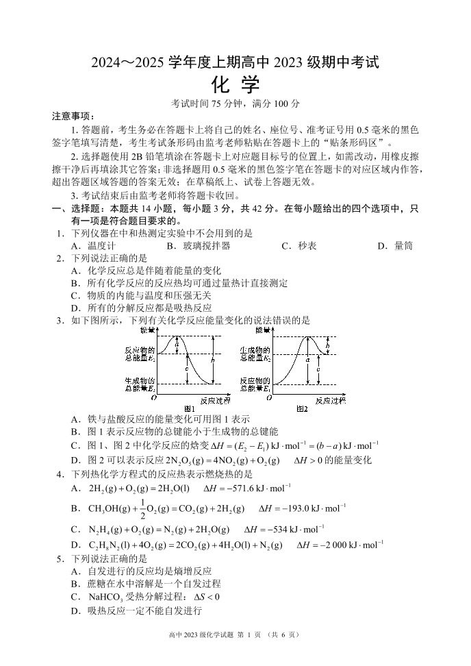 四川省成都市蓉城部分学校2024-2025学年度高中2023级期中考试化学