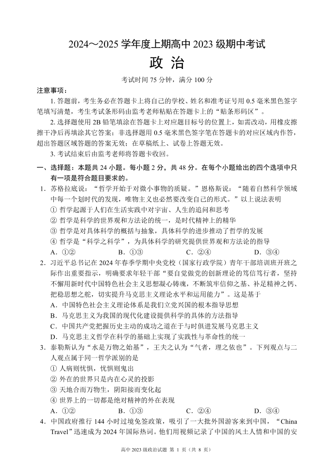 四川省成都市蓉城部分学校2024-2025学年度高中2023级期中考试政治