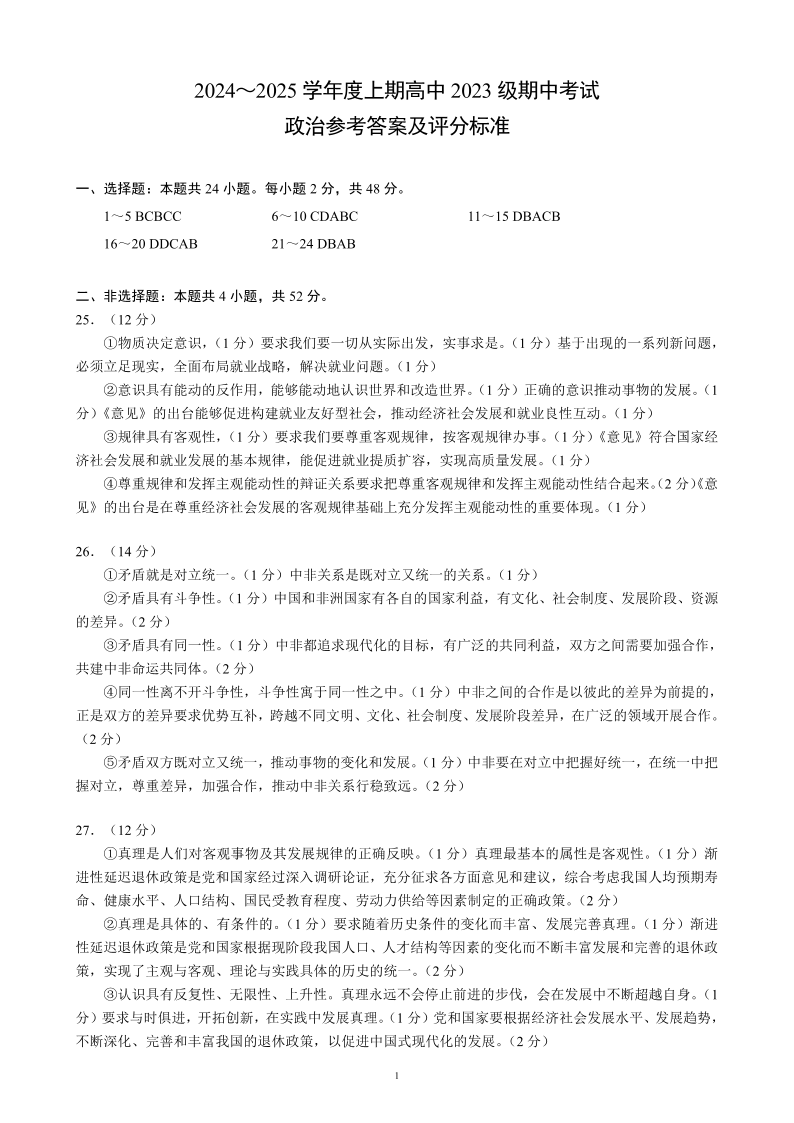 四川省成都市蓉城部分学校2024-2025学年度高中2023级期中考试政治答案