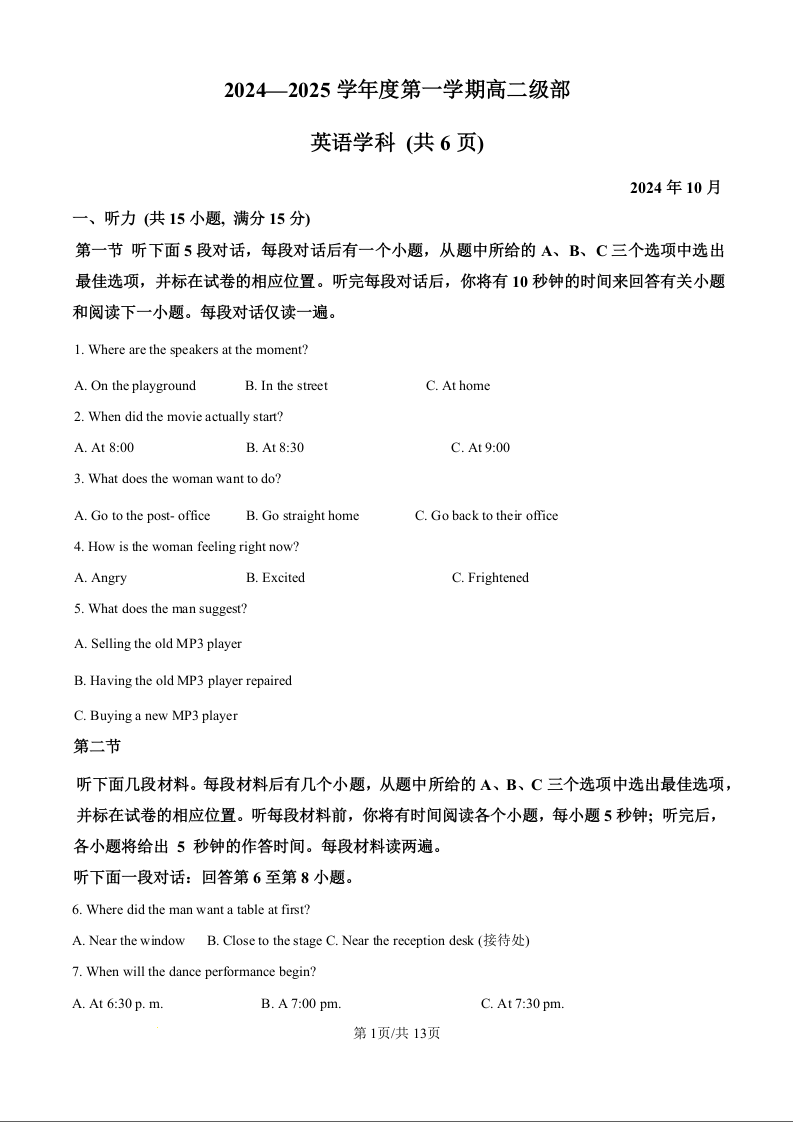 天津市天津市河西区新华中学2024-2025学年高二上学期10月月考英语(原卷版)
