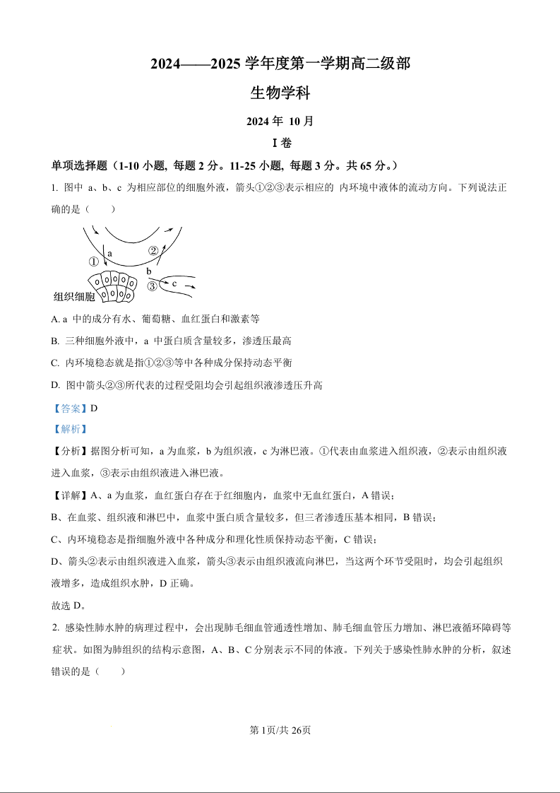 天津市天津市河西区新华中学2024-2025学年高二上学期10月月考生物(解析版)