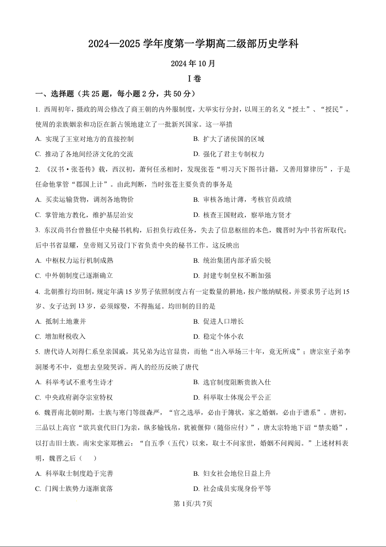 天津市天津市河西区新华中学2024-2025学年高二上学期10月月考历史(原卷版)