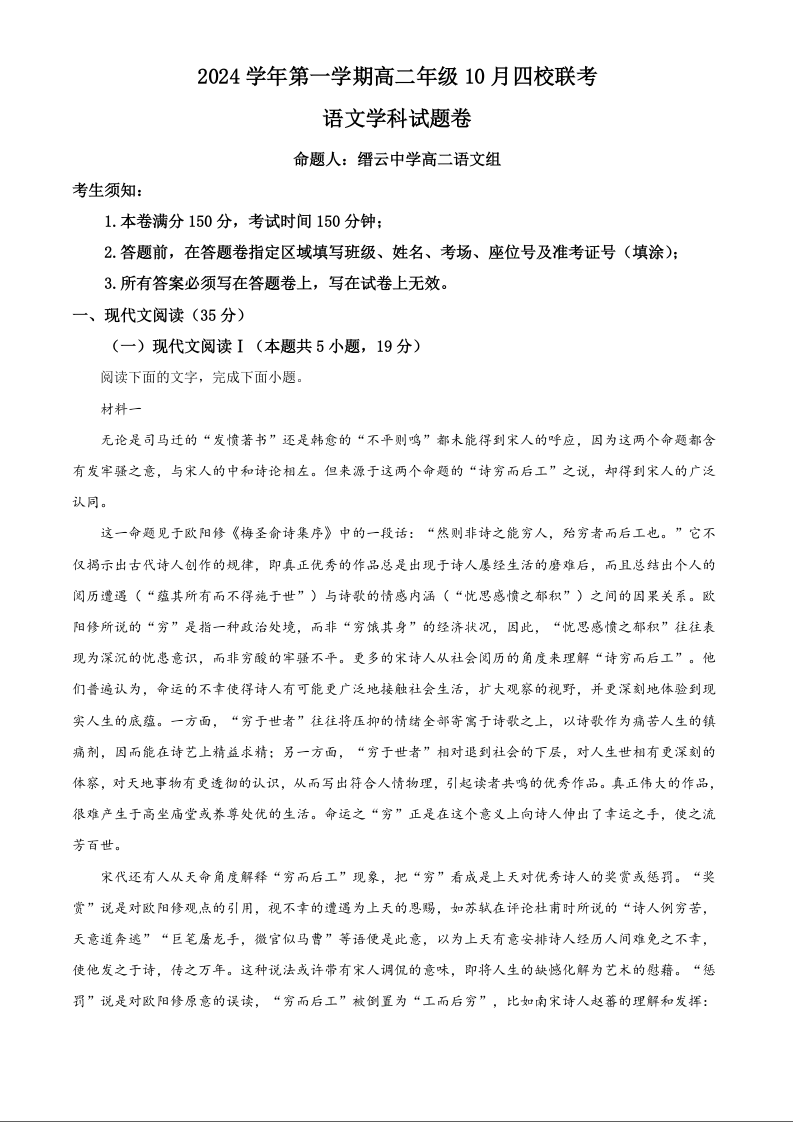 浙江省杭州市周边重点中学四校2024学年第一学期高二年级10月四校联考语文答案