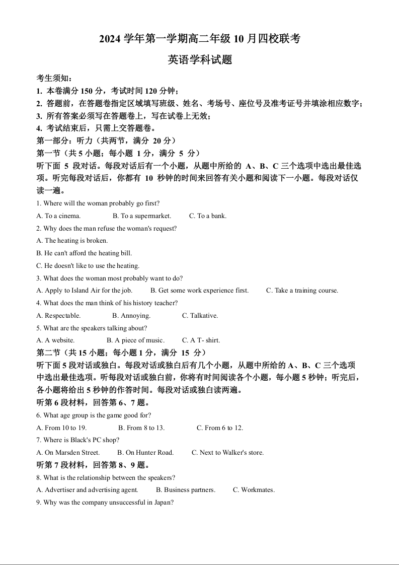 浙江省杭州市周边重点中学四校2024学年第一学期高二年级10月四校联考英语答案