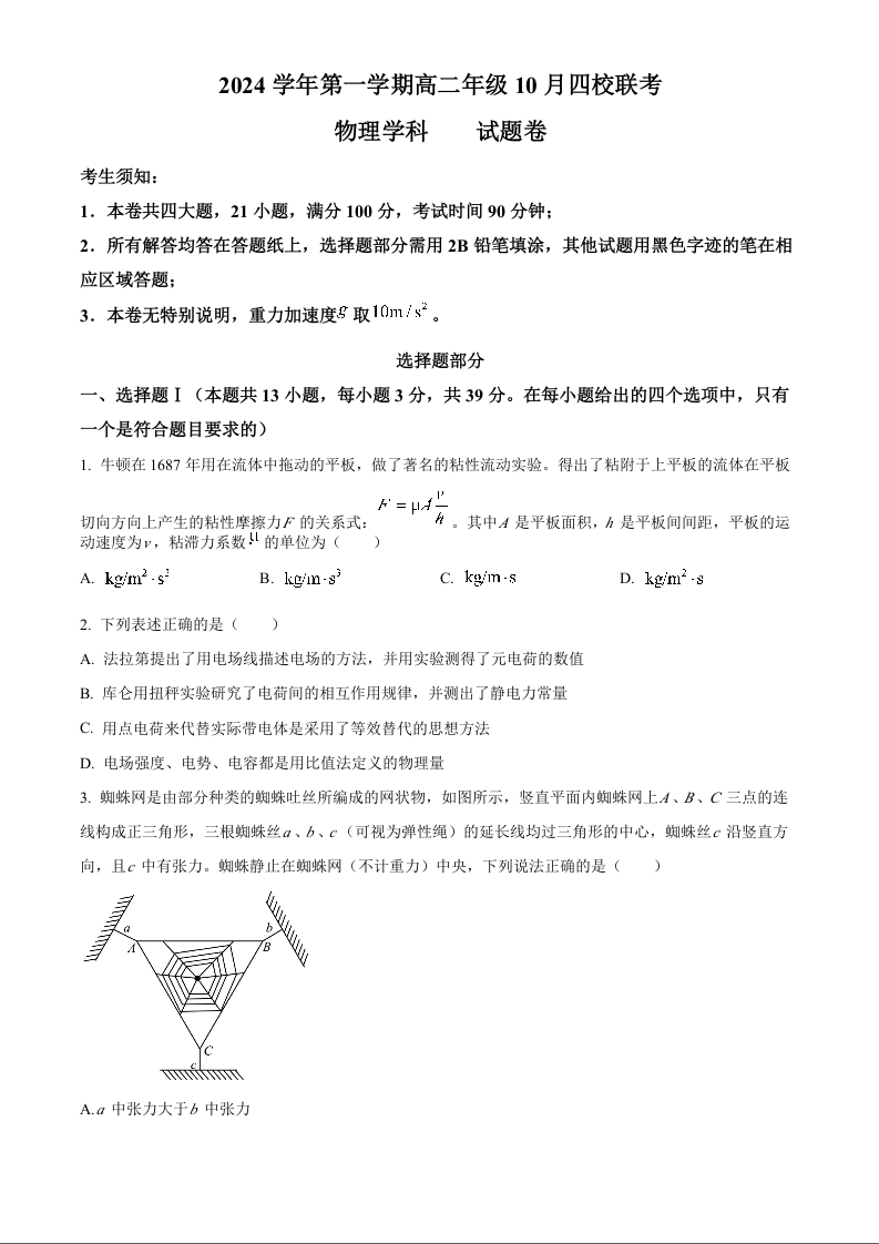 浙江省杭州市周边重点中学四校2024学年第一学期高二年级10月四校联考物理