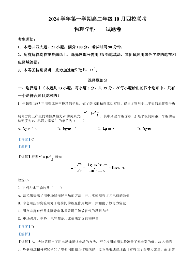 浙江省杭州市周边重点中学四校2024学年第一学期高二年级10月四校联考物理答案