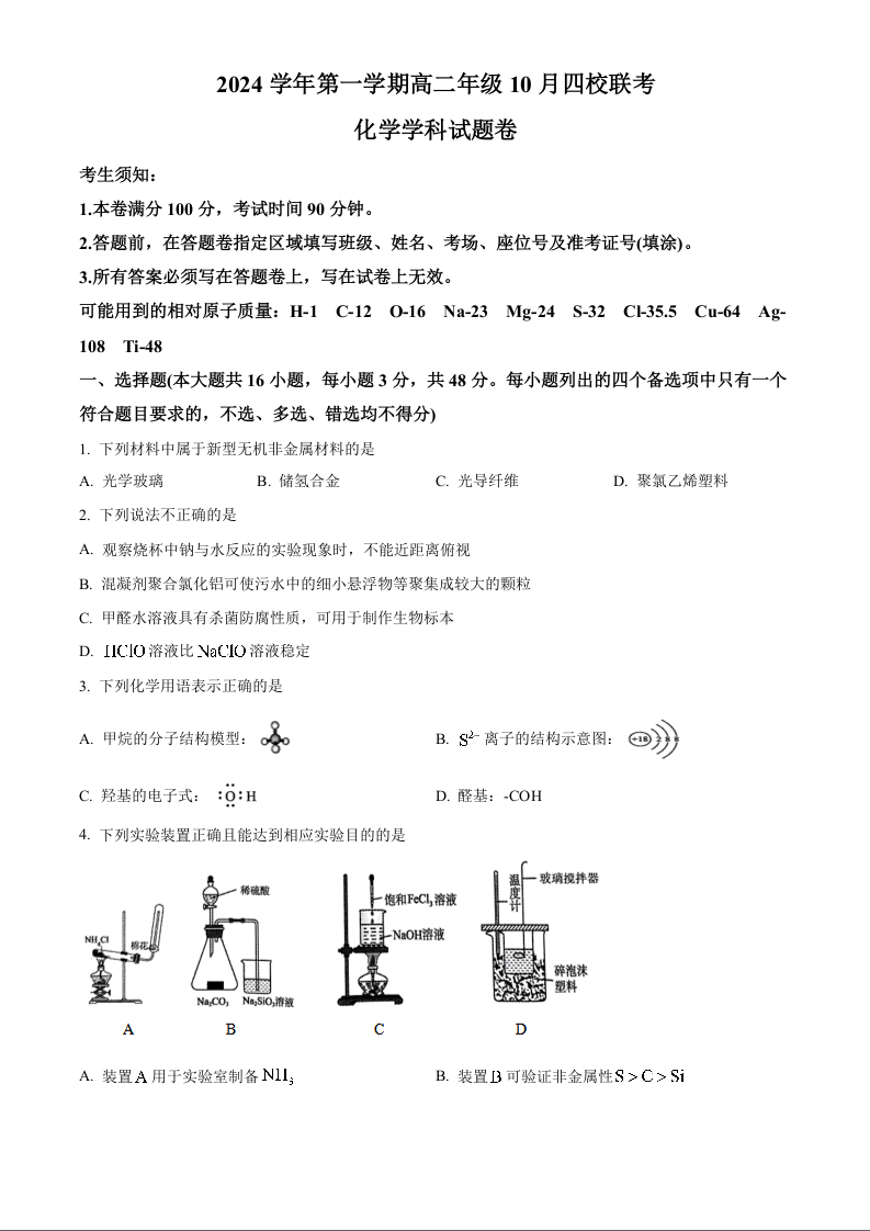 浙江省杭州市周边重点中学四校2024学年第一学期高二年级10月四校联考化学