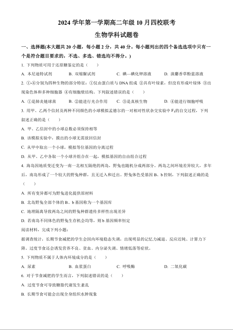 浙江省杭州市周边重点中学四校2024学年第一学期高二年级10月四校联考生物