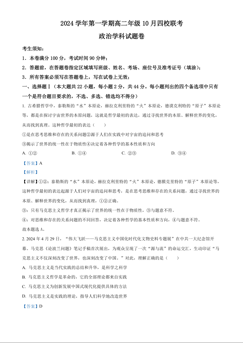 浙江省杭州市周边重点中学四校2024学年第一学期高二年级10月四校联考政治答案