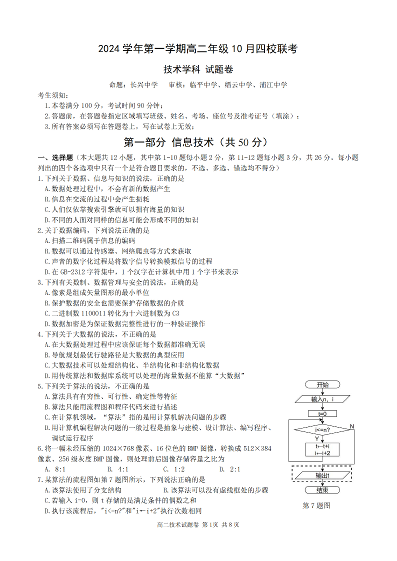 浙江省杭州市周边重点中学四校2024学年第一学期高二年级10月四校联考技术+答案