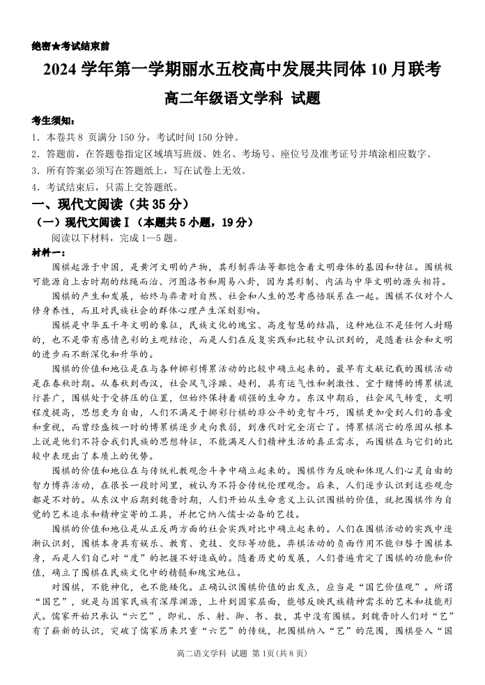 浙江省丽水五校高中发展共同体2024 学年第一学期 10 月联考语文