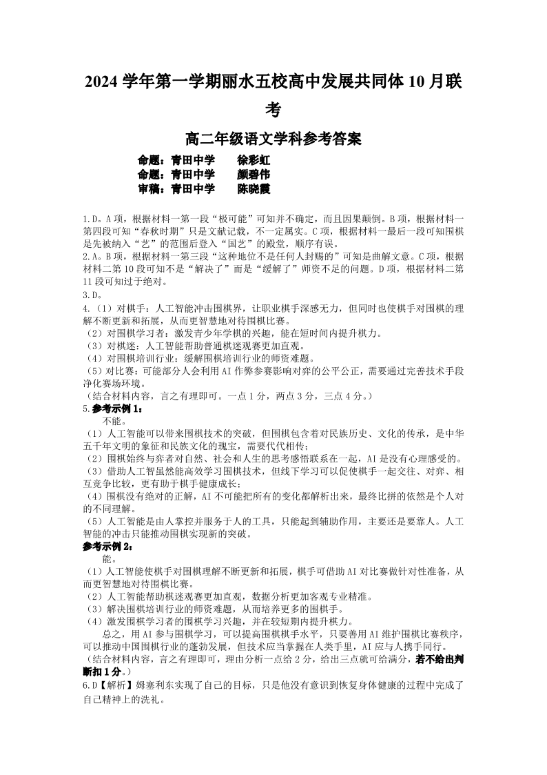 浙江省丽水五校高中发展共同体2024 学年第一学期 10 月联考语文答案