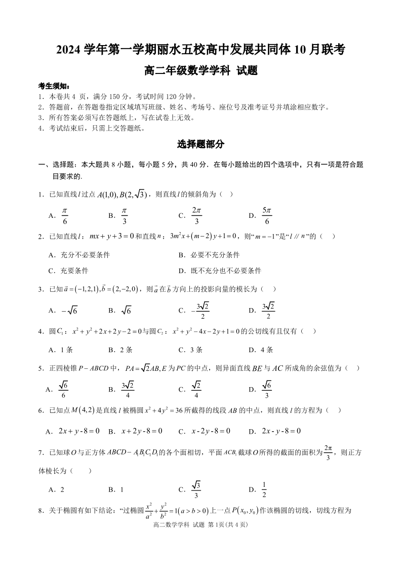 浙江省丽水五校高中发展共同体2024 学年第一学期 10 月联考数学