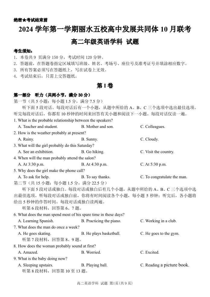 浙江省丽水五校高中发展共同体2024 学年第一学期 10 月联考英语