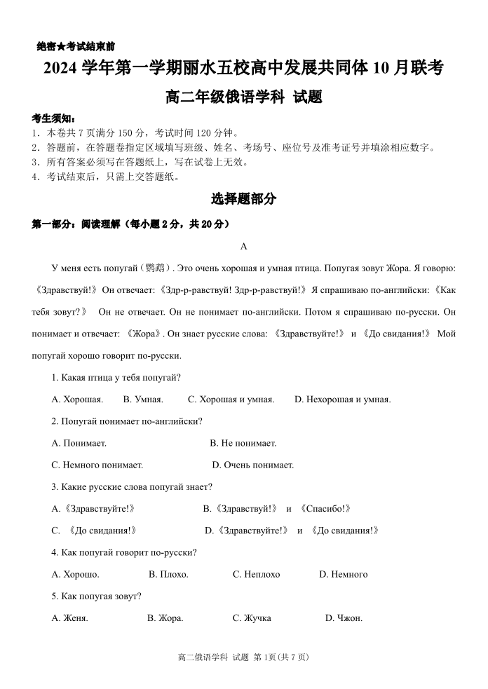 浙江省丽水五校高中发展共同体2024 学年第一学期 10 月联考俄语