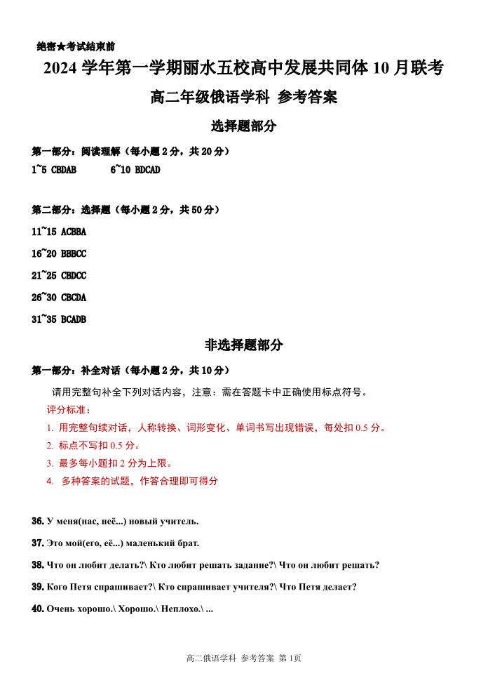 浙江省丽水五校高中发展共同体2024 学年第一学期 10 月联考俄语答案