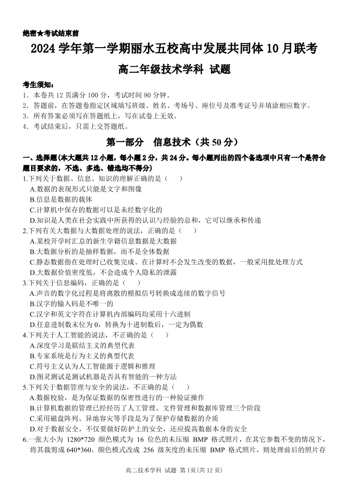 浙江省丽水五校高中发展共同体2024 学年第一学期 10 月联考技术