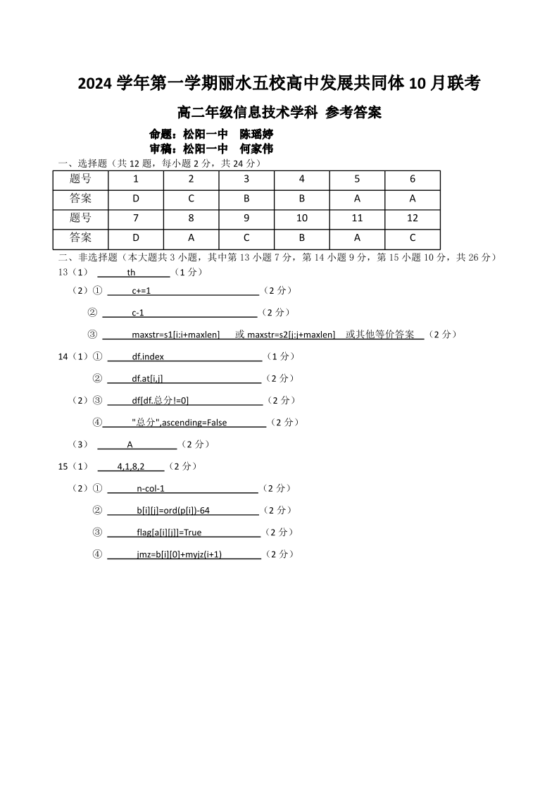 浙江省丽水五校高中发展共同体2024 学年第一学期 10 月联考技术答案